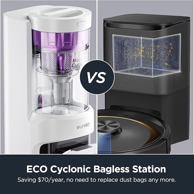 - 【Bagless Self-emptying Station】Say farewell to messy, wasteful cleaning with eureka E10s bagless self-emptying station. This system keep dust at bay for up to 45 days. What's more, its bagless design means you won't have to splurge on more dust bags, saving you up to $70 a year.