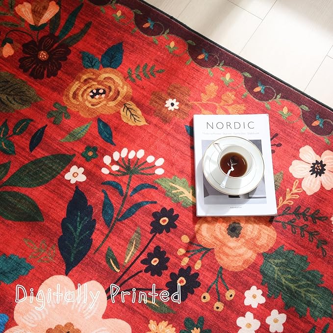 Door Mat Indoor Entrance 2x3 Rug Machine Washable Boho Floral Small Area Rug Non-Slip Low Pile Throw Rugs for Entryway, Kitchen, Front Door Indoor Entrance, Entry, Kids Room (Red)
