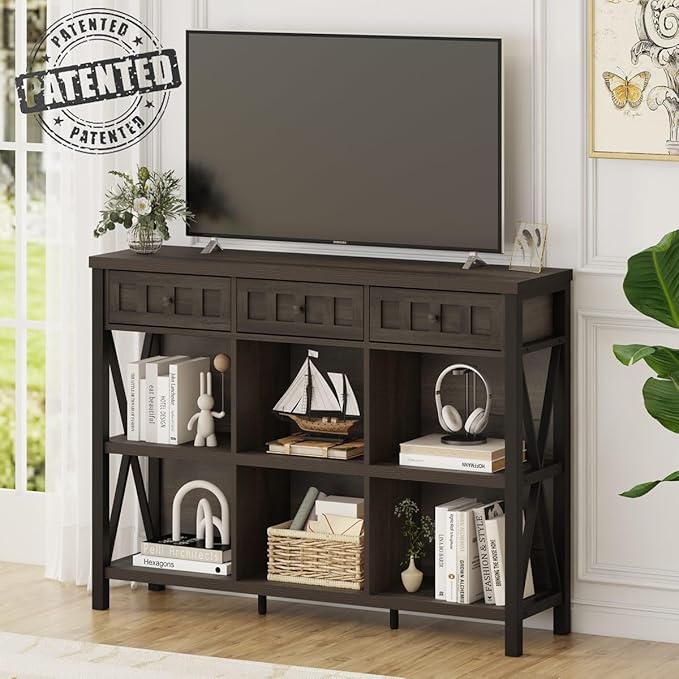 FATORRI Rustic 6 Cube Storage Organizer Bookshelf with 3 Drawers, Short Low Horizontal Bookshelf for Living Room, Industrial Wood and Metal Cubby Bookcase for Home Office (Walnut Brown, 47 Inch)