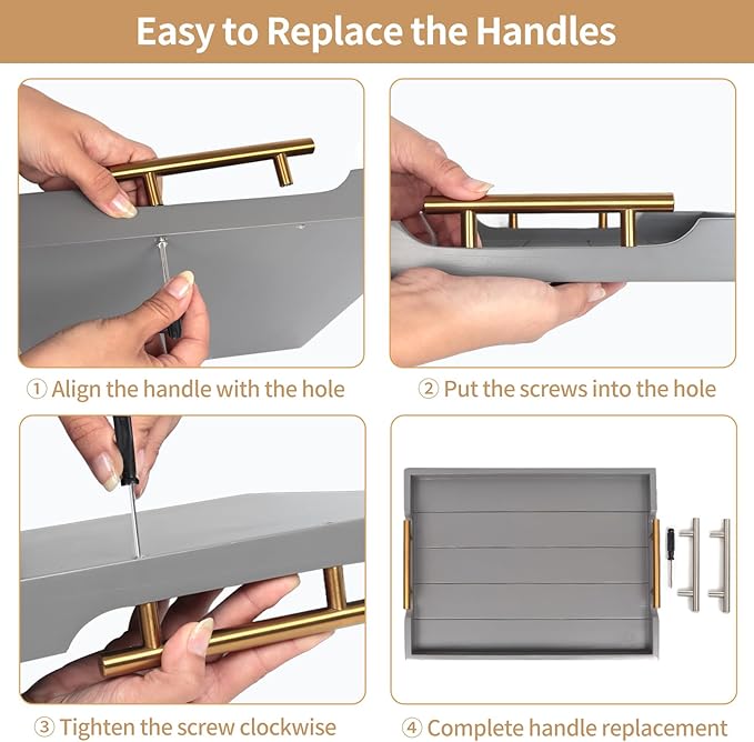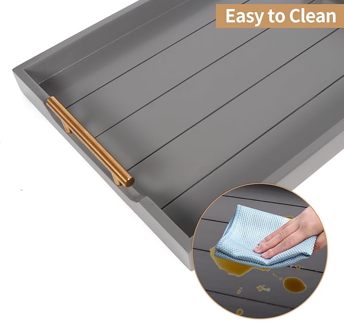 - 【SELECT YOUR HANDLE COLOR】Why not cost one money to get double happiness? Try our deluxe large gray wooden tray for ottoman with 2 sets of metal handles. Now we offer two colors premium polished gold and silver for replacement. Let's test your operational ability with the fantastic wood serving tray.