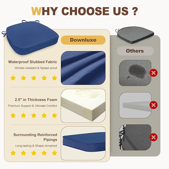 downluxe Chair Cushions for Dining Chairs, Waterproof Kitchen Chair Pads, Non-Slip Dining Seat Cushion with Ties, 17" x 16" x 2.5", Blue, 4 Pack