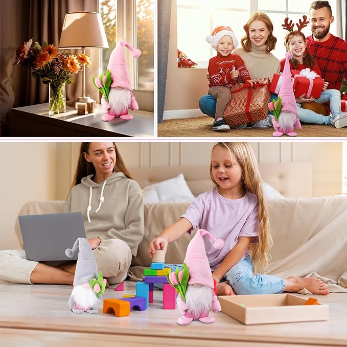 - đăUnique Design&Heartwarming GiftăPink Plush Gnome Dolls holding tulips and wear long hats will be the hit of your every occasion. They seem to say wish you happy and lucky. Bring a special gift for holiday with this adorable gnome plush decoration, the perfect choice to express infinite love for your mom or lovers.A warm gift to wife, mom,grandma, girlfriend, teacher or people who collect gnomes, and bring them good luck, love and warm.