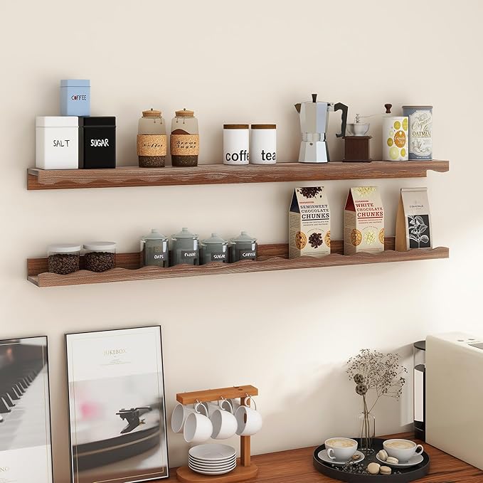 Fun Memories Picture Ledge Shelf for Wall, 48 inch Pine Wood Nursery Book Shelves Set of 2- Wall Book Shelves for Kids Room, Home Decor - Kitchen Spice-Carbonized