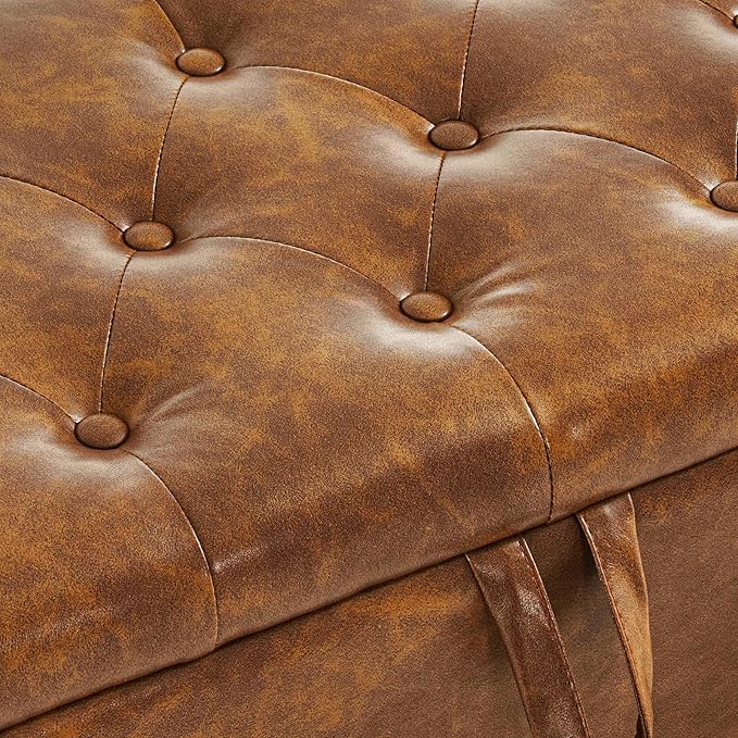 Furniliving Storage Ottoman Bench, Leather Benches End of Bed Bench with Solid Wood Legs Upholstered Ottoman Bench with Storage Indoor Bench for Living Room with Rolled Arm, Entryway, YellowBrown