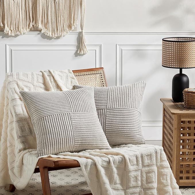 Fancy Homi 2 Packs Neutral Grey Decorative Throw Pillow Covers 20x20 Inch for Living Room Couch Bed Sofa, Farmhouse Boho Home Decor, Soft Corss Corduroy Patchwork Accent Square Cushion Case 50x50 cm