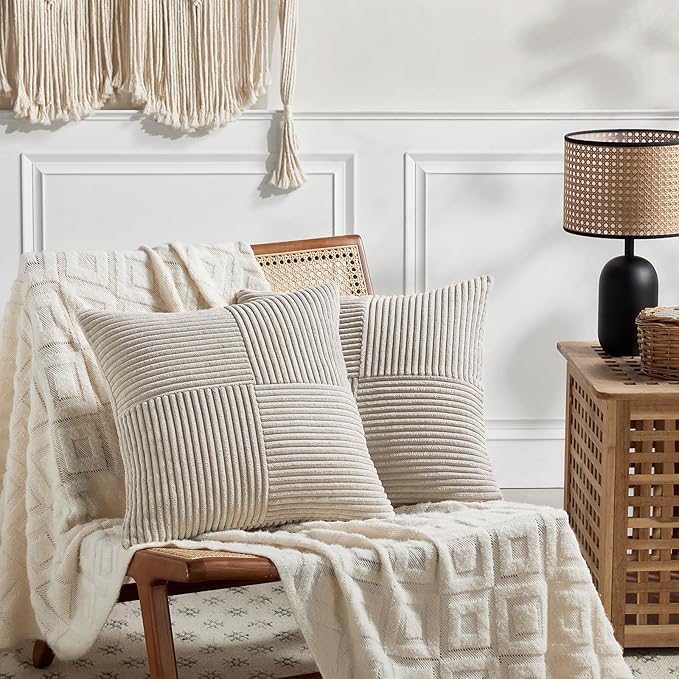 Fancy Homi 2 Packs Neutral Taupe Decorative Throw Pillow Covers 20x20 Inch for Living Room Couch Bed Sofa, Farmhouse Boho Home Decor, Soft Corss Corduroy Patchwork Accent Square Cushion Case 50x50 cm