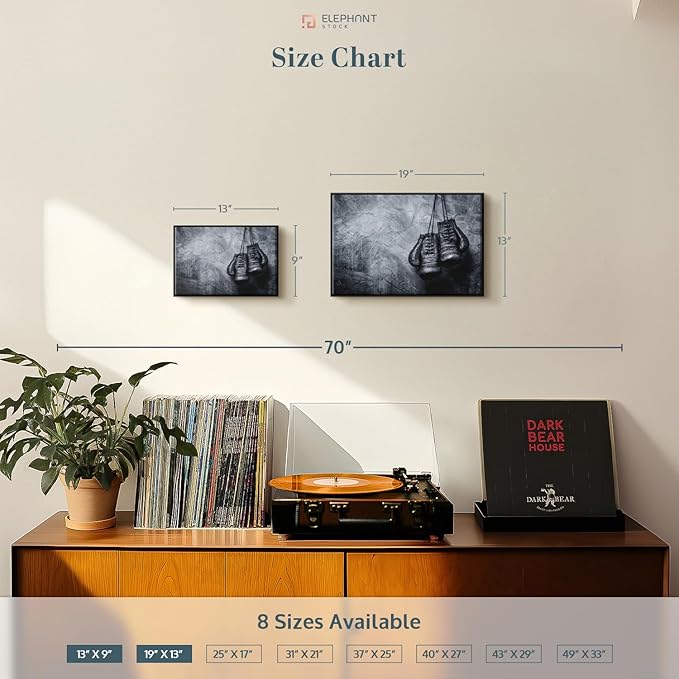 ElephantStock Boxing Gloves Wall Art - Horizontal Framed Canvas - 1-Piece Living Room Wall Decor - Photography Sports Canvas Print - Black and Gray Decor for Wall - 19" X 13"
