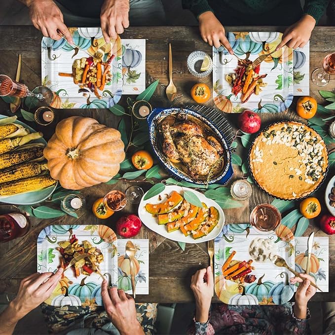 - Blue Pumpkin and Wood Grain Design: Our autumn thanksgiving paper plates set features watercolor style, adopting a large capacity square plates, use white wood grain as the base color, with white, blue and orange pumpkins, simple and stylish, elegant and generous. It can be well paired with certain occasions or table decorations, with a natural and refreshing color that makes people feel relaxed and comfortable, very suitable for fall party and thanksgiving party.