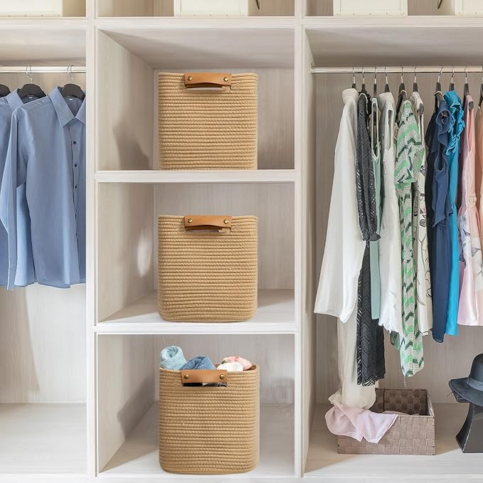 danpinera 3 Pack 11 Inch Woven Baskets for Storage, Stylish Storage Baskets for Shelves, Laundry, Bathroom, Kitchen, Cube Storage Bin, Cotton Rope Boho Baskets, Jute
