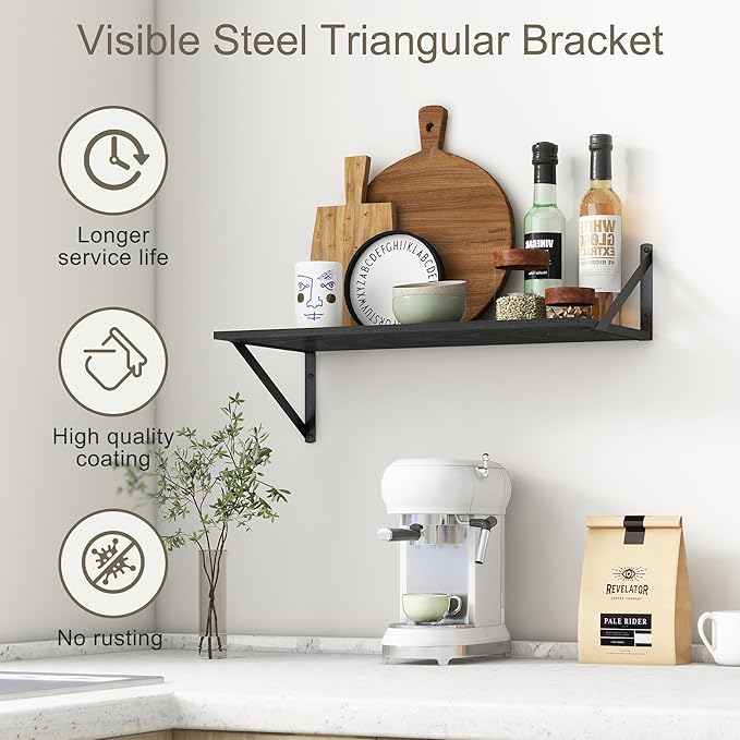 - 【FARMHOUSE RUSTIC WALL SHELF】These floating shelves are made of premium engineered wood board and visible triangular bracket. The rustic wooden grain surface add character and warmth to any modern or traditional interior with these deep floating shelves, contrast shelves at staggering heights on the wall or mount side-by-side or in the corner for a clean streamlined look.