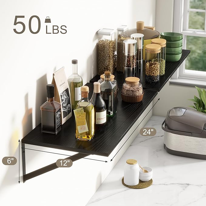 Deep Floating Shelves, 12 Inch Deep Floating Shelves for Wall, 24"W x 12"D Wall Shelves for Books, Rustic Black Wooden Shelves, Large Wide Display Shelf for Bathroom, Living Room, Bedroom, Set of 2