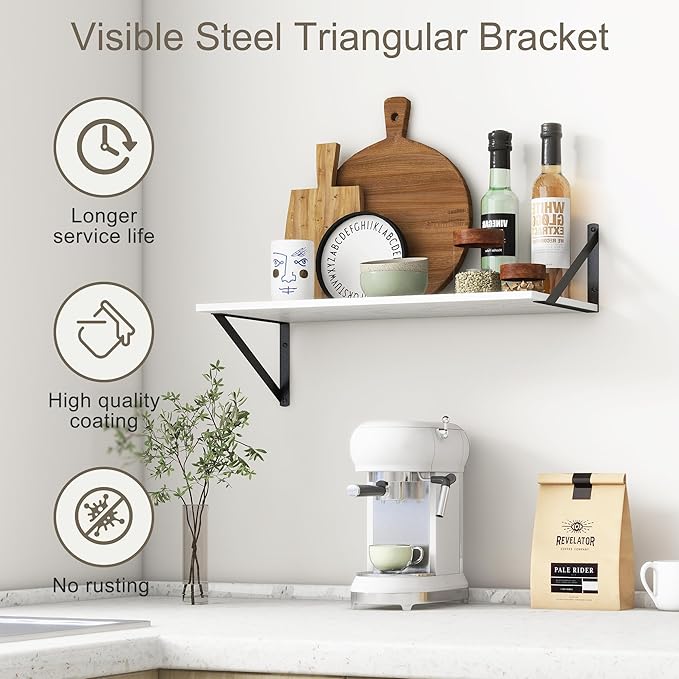 - 【FARMHOUSE RUSTIC WALL SHELF】These floating shelves are made of premium engineered wood board and visible triangular bracket. The rustic wooden grain surface add character and warmth to any modern or traditional interior with these deep floating shelves, contrast shelves at staggering heights on the wall or mount side-by-side or in the corner for a clean streamlined look.