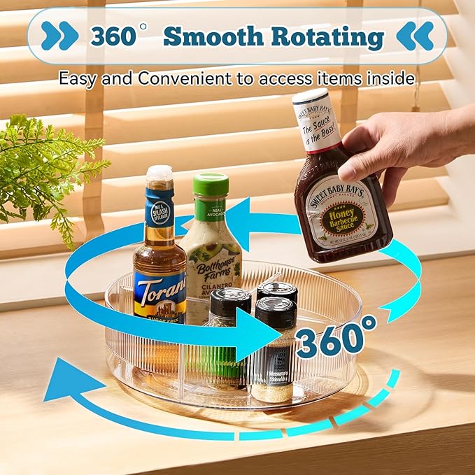- MULTIPURPOSE ORGANIZER: This versatile Lazy Susan turntable is perfect for a variety of uses. Organize your spices, seasonings, snacks or even display items on a shelf. It also serves as a stylish cosmetics, perfumes holder or a bathroom organizer, keeping your desktop neat and tidy. The upgraded divider design makes it easier for you to separate and organize different items.