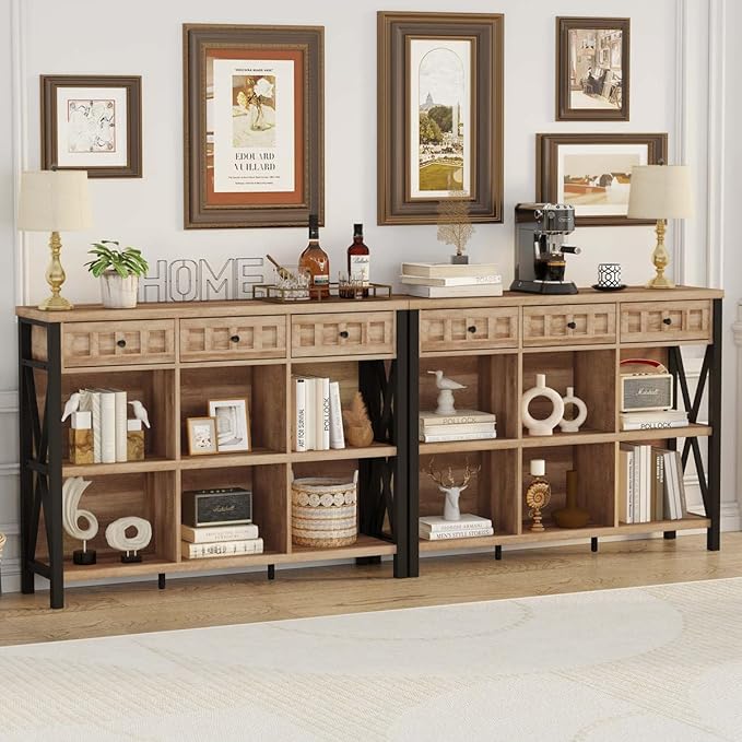 FATORRI Rustic 6 Cube Storage Organizer Shelf with 3 Drawers, Long Horizontal Bookshelf, Industrial Wood and Metal Cubby Bookcase for Living Room (Rustic Oak, 47 Inch)