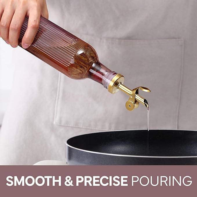 - Beautiful and Functional - Our colored glass oil dispensing bottles, with elegeant colors, gold tops and gold wire rack, will elevate your kitchen. Don't use just any oil bottle, upgrade the way you cook. That's our mission.