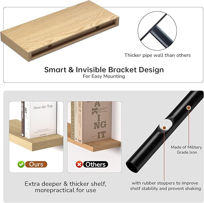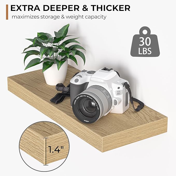 - Extra Deeper & Thicker - Each board measures 16"W x 6.7"D x 1.4"H. Extra deeper and thicker design in order to bring maximizes storage space and weight capacity, even hold up to 30 lb each. This floating shelf taking up zero square feet, reduces clutter and highlights décor in compact spaces. even hold up to 50 lb each. This floating shelf taking up zero square feet, reduces clutter and highlights décor in compact spaces.