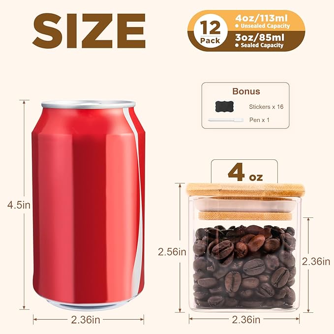- [Product details] Square glass storage jar height:2.56in. Diameter:2.36in. Capacity:4oz(113ml). Package contains: 12pcs. 12 pieces glass pantry storage containers with same volume meet you various storage need.