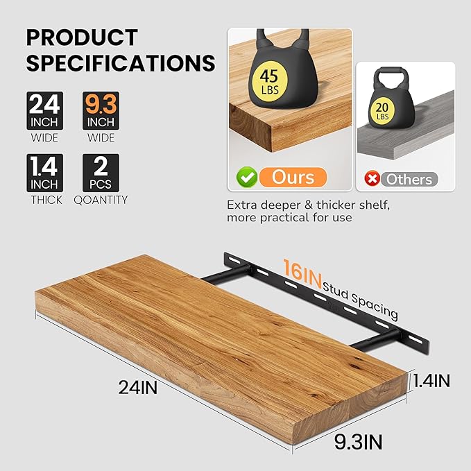 - EASY INSTALLATION: Our floating shelf bracket aligns with standard 16" wall studs and sits flush for a clean finish. Each shelf comes with detailed instructions, a magnetic level, self-tapping drywall anchors, and screws. Whether you're new to this or experienced, you can securely mount these rustic shelves in minutes