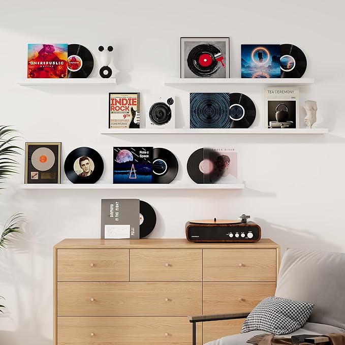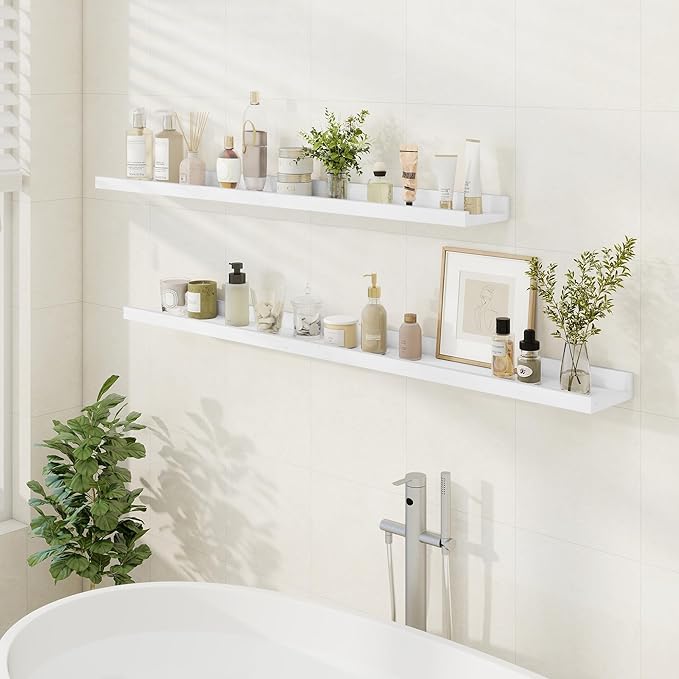 • Picture Ledge Design: Ideal for displaying photos, artwork, small plants, or collectibles, these shelves feature a thoughtful ledge design with a subtle lip and a shallow groove behind it. This design securely holds items in place while maintaining a clean, modern look.