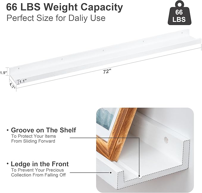 • Picture Ledge Design: Ideal for displaying photos, artwork, small plants, or collectibles, these shelves feature a thoughtful ledge design with a subtle lip and a shallow groove behind it. This design securely holds items in place while maintaining a clean, modern look.