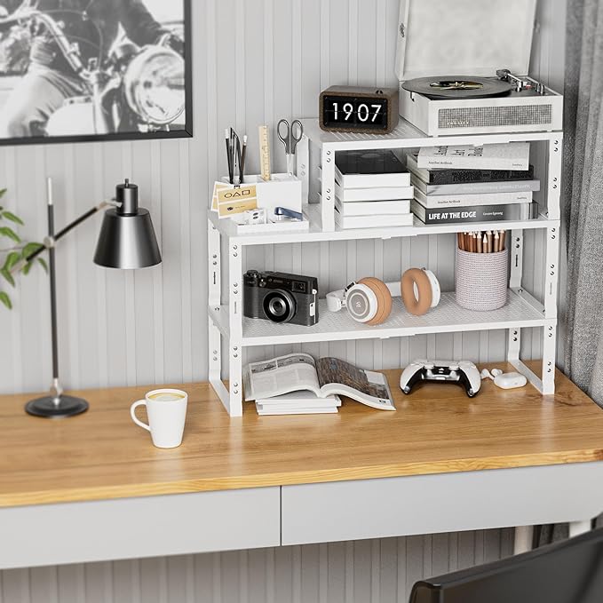 - ⭐【Expandable,Stackable】The shelves can easily expand and contract according to your storage needs, whether it is kitchen clutter or office supplies.You can combine multiple shelves together to form a large storage system, or separate them into several separate smaller units(Measure:10.24"D x 16.54"W~27.17"W x 8.31"H/7.68"H/7.05"H/6.42"H)
