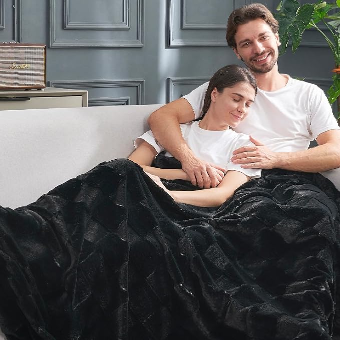 Cozy Bliss Checkered Large Faux Rabbit Fur Black Twin Bed Blanket, Soft Fuzzy Fluffy Minky Furry Plush Blankets for Couch, Bed, Adults (60 * 80 Inches Black)
