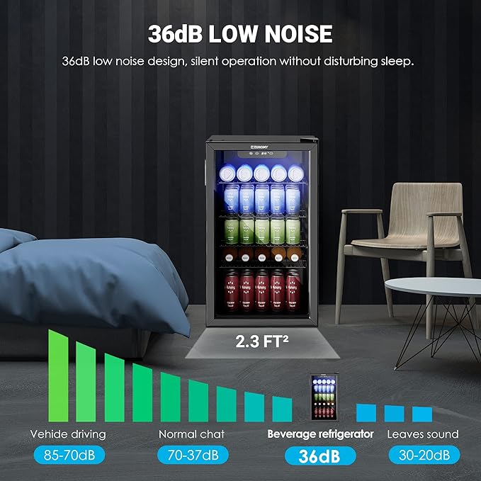 - VERSATILE DESIGN - The bottom of the small fridge is installed with height-adjustable feet to maintain balance on uneven floors, and the top sh is designed with reversible hinges for easy door change operations. The mini fridge glass door is built-in with a high-performance compressor, which will only consume 0.74kwh per day, and produces 36dB when running that won't affect your sleep