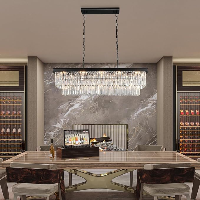 - BLACK CRYSTAL CHANDELIERS:This chandeliers for dining room using K9 crystal with 2-tier design and black rectangular lamp frame.When you turn on the light,the lighting will reflect through the crystal,adding a romantic and unique atmosphere to your room