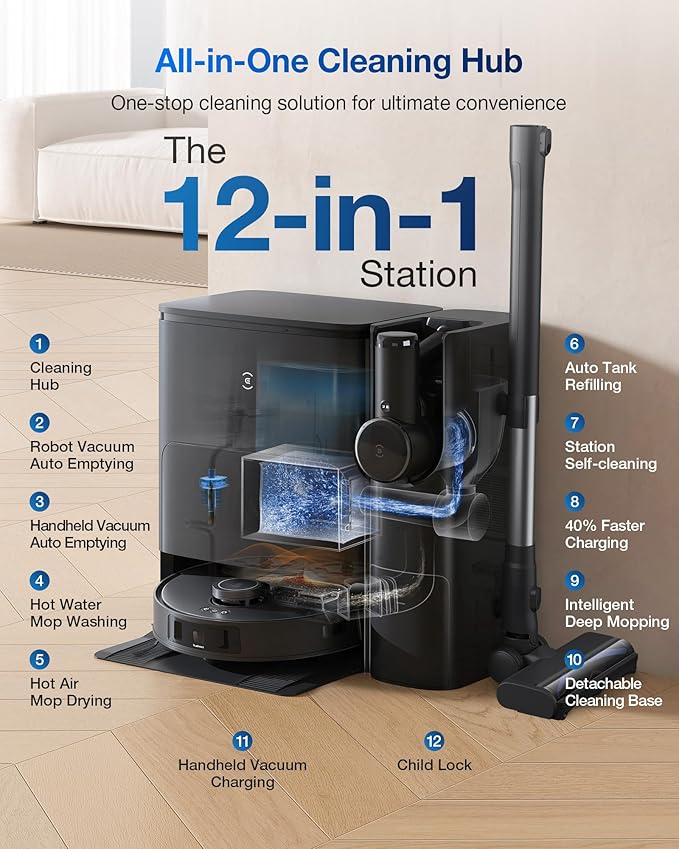 - [All-in-One Cleaning Hub] This space-saving design features a bidirectional dust collection system, allowing both vacuums to auto-empty their dustbins into the station's large capacity bag. Plus, it also supports 158℉ hot-water mop washing, hot-air drying and auto water refilling. Ready to tackle any cleaning task, save you time and effort.