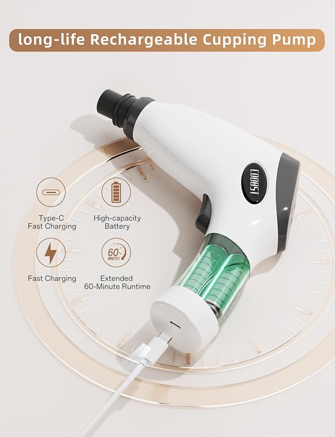 - 【Advanced Electric Cupping & Gua Sha 2-in-1 System】- Unlike traditional cups, this USB-rechargeable device features a high-torque motor for stronger, consistent suction, while the built-in lithium battery delivers 60 mins of cordless runtime. The multi-purpose nozzle allows seamless switching between cupping therapy and gua sha massage, making it the ultimate all-in-one cupping therapy set for modern self-care.