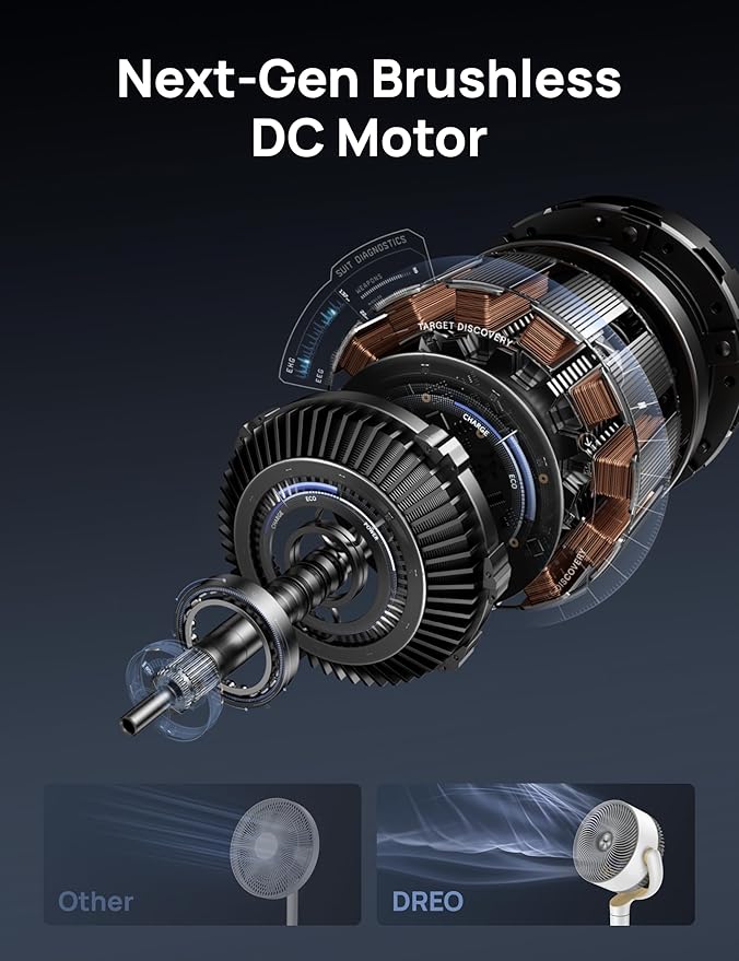 - 𝙐𝙡𝙩𝙧𝙖 𝙌𝙪𝙞𝙚𝙩 𝘿𝘾 𝙈𝙤𝙩𝙤𝙧: Don't sacrifice performance for quietness, it reduces noise down to 20dB, making it the ideal quiet fan for bedtime or working without distractions. Thanks to the DREO brushless DC motor combined with turbine style blade technology, it circulates the air quickly throughout the room. And the DC motor produces 30% more air using 40% less energy.