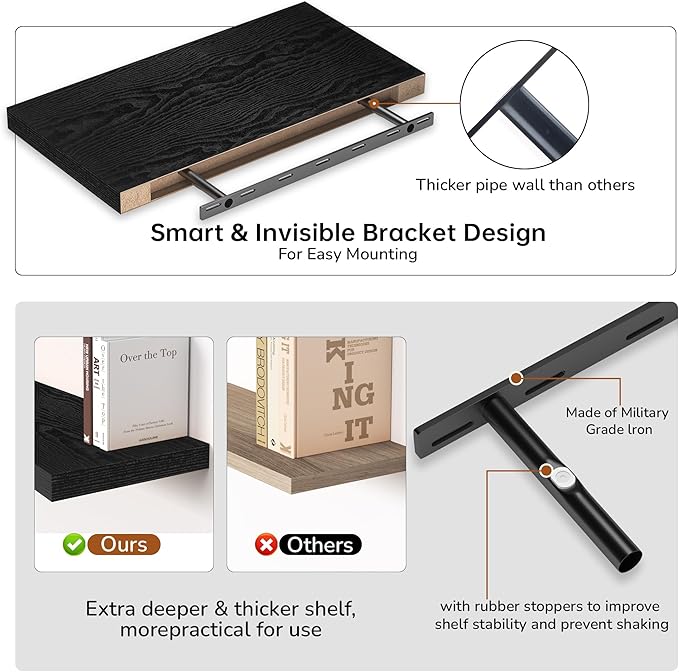 - Extra Deeper & Thicker - Each board measures 24"W x 12"D x 1.5"H. Extra deeper and thicker design in order to bring maximizes storage space and weight capacity, even hold up to 50 lb each. This floating shelf taking up zero square feet, reduces clutter and highlights décor in compact spaces.