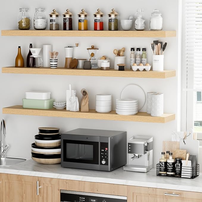 - Versatile & Multi-Scene Functionality: Our floating shelves are available in a variety of sizes and thicknesses, allowing you to choose the perfect fit for your space. Use them in the bathroom to store beauty products, hair care items. In the bedroom, they can hold books, cosmetics, and personal items. In the kitchen, they’re perfect for spices, jars, or small utensils. Or display photo frames, trophies, or collections in the living room. These shelves efficiently use wall space to create a tidier, more spacious feel in any room.