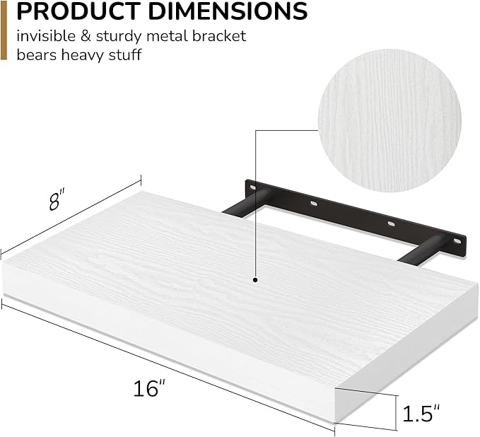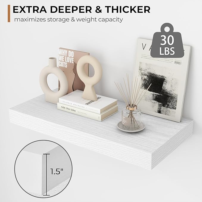 - Extra Deeper & Thicker - Each board measures 16"W x 8"D x 1.5"H. Extra deeper and thicker design in order to bring maximizes storage space and weight capacity, even hold up to 30 lb each. This floating shelf taking up zero square feet, reduces clutter and highlights décor in compact spaces.