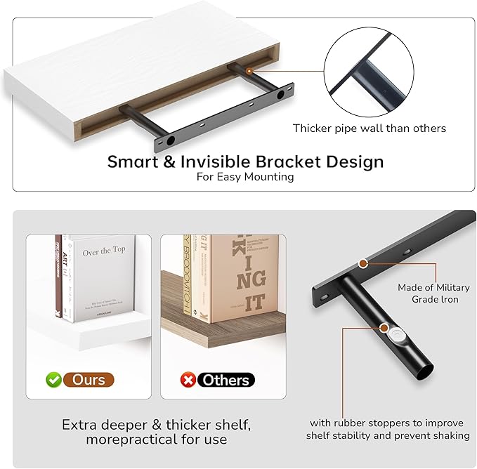 - Easy to Assemble & Install: Each shelf comes with everything you need for quick and easy assembly: durable steel invisible brackets, toggle bolts for drywall, and a straightforward instruction manual. With just one or two boards and a few screws, you can have the shelf up in no time. The included step-by-step instructions make the installation process hassle-free, and our customer support team is always available if you need assistance.