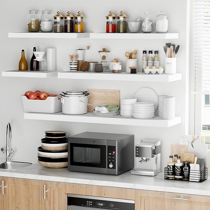 - Versatile & Multi-Scene Functionality: Our floating shelves are available in a variety of sizes and thicknesses, allowing you to choose the perfect fit for your space. Use them in the bathroom to store beauty products, hair care items. In the bedroom, they can hold books, cosmetics, and personal items. In the kitchen, they’re perfect for spices, jars, or small utensils. Or display photo frames, trophies, or collections in the living room. These shelves efficiently use wall space to create a tidier, more spacious feel in any room.