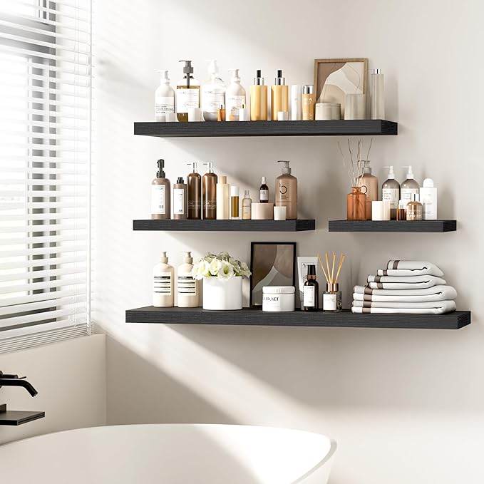 - Versatile & Multi-Scene Functionality: Our floating shelves are available in a variety of sizes and thicknesses, allowing you to choose the perfect fit for your space. Use them in the bathroom to store beauty products, hair care items. In the bedroom, they can hold books, cosmetics, and personal items. In the kitchen, they’re perfect for spices, jars, or small utensils. Or display photo frames, trophies, or collections in the living room. These shelves efficiently use wall space to create a tidier, more spacious feel in any room.
