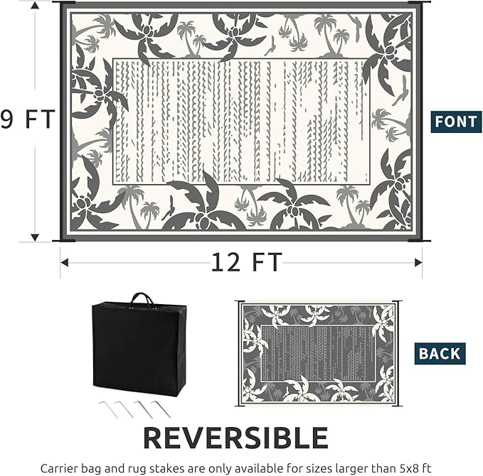 - Lightweight & Versatile: The outdoor plastic straw rug can be rolled or folded into a compact size and comes with a handy carrying bag for easy transportation. It’s perfect for outings, picnics, sunbathing, and RV road trips. Note: The outdoor rug 5x8 ft size does not include a carrying bag or rug stakes.