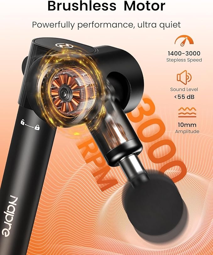 - Up to 3000 rpm(32-speed) & Long Service Time: Stepless speed regulation,32-speeds from 1400 to 3000 rpm controlled by the roller are provided for different muscle groups, aiding in sore muscle massage, relaxing and shaping different muscle parts; it built with a quiet brushless motor,life is almost 50 X longer than brush motor, working noiseas low as 40 dB, which blends in with ambient sound to offer you an enjoyable and quiet massage experience