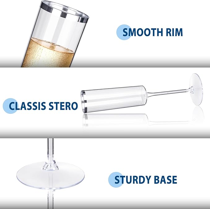 Ciaell 24 Pack Silver Plastic Champagne Flutes - 6 Oz Disposable Champagne Glasses - Square Silver Rim Plastic Toasting Glasses for Party Birthday Anniversary Wedding