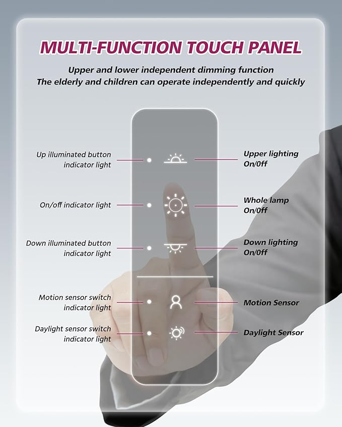 - Stepless Dimming: Stepless dimming technology allows continuous and smooth adjustment of light from darkest to brightest, adjusting the light intensity according to different activities, providing soft to bright light, perfectly adapting to different light needs; the upper and lower panels can be adjusted independently with two touch points, so that the brightness of the upper and lower light-emitting panels can be adjusted according to the needs