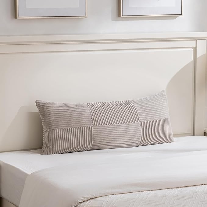 Fancy Homi Set of 2 Neutral Taupe Boho Long Lumbar Body Decorative Throw Pillow Cover 14x36 Inch for Bed Couch Bedroom Bench, Soft Patchwork Corduroy Textured Pillow Case, Farmhouse Room Decor