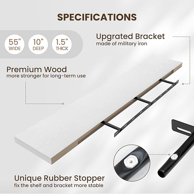 - VERSATILE WALL SHELVES: This 55 inches floating shelf is a versatile solution for any room in your home. Whether used in the living room, bedroom, office, or kitchen, it can be styled to suit various purposes, from displaying art to organizing everyday items. Perfect for enhancing any decor