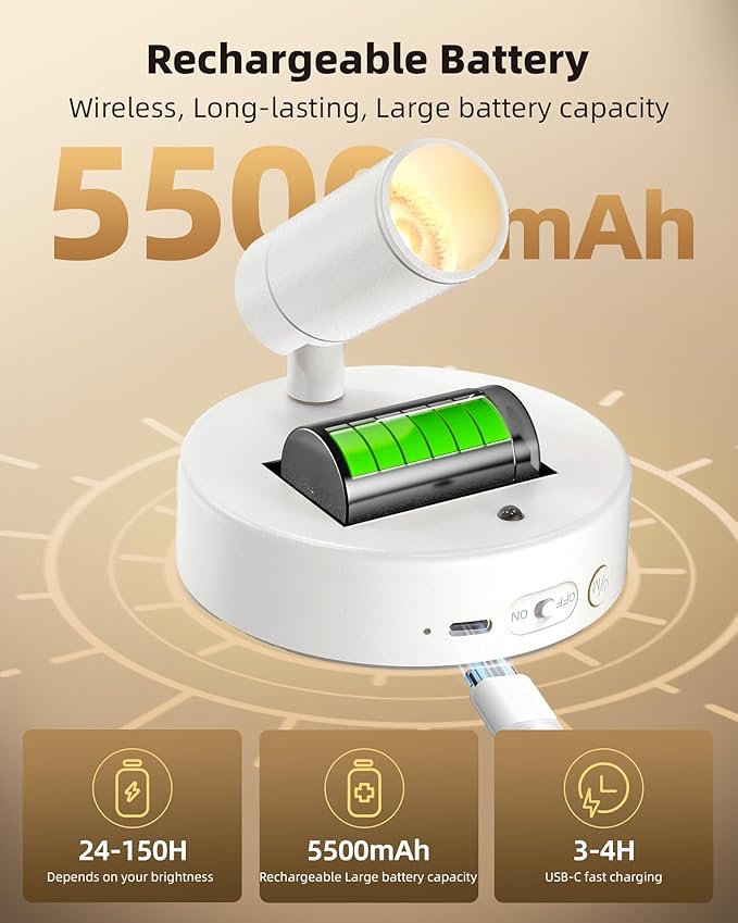 - 5500mAh Rechargeable Spotlight: The EZVALO plant spotlight indoor features a powerful 5500mAh rechargeable battery, Provide up to 150 hours of low brightness and 24 hours of high brightness lighting.Using the equipped USB-C fast charging, Battery operated spot light can be fully charged within 4 hours, providing cordless, long-lasting 100 lumens glare-free lighting,Very suitable for indoor plant lighting and picture lighting