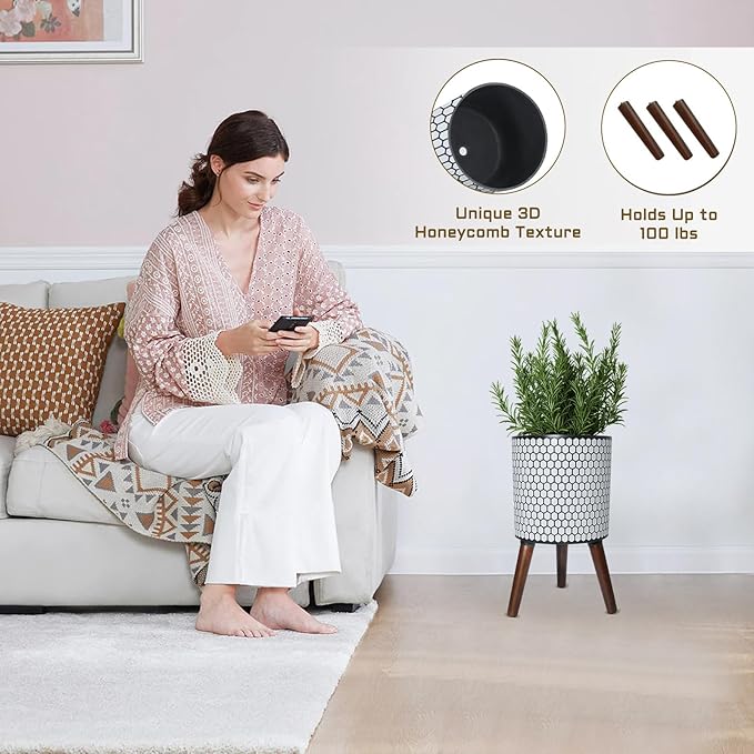 - 【Why Choose A Flower Pot With A Stand? 】This standing plant pot features a 3D honeycomb texture on its surface, seamlessly integrating the natural beehive structure into interior decor. The raised wooden legs raise the flower pot, creating an elegant and orderly atmosphere in the room.