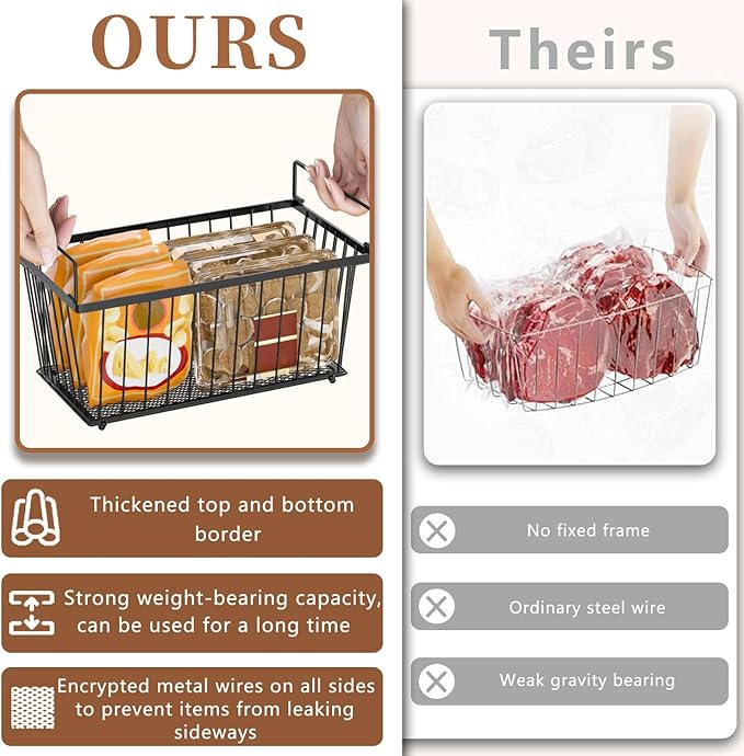 - Thickened Frame and Four-Sided Metal Mesh: Our chest freezer organizer bins are made of high-quality metal, with reinforced and thickened upper and lower frames and dense metal mesh design on all four sides, providing stronger load-bearing capacity and resistance to deformation. Therefore, this chest freezer organizer is more durable compared to regular models.