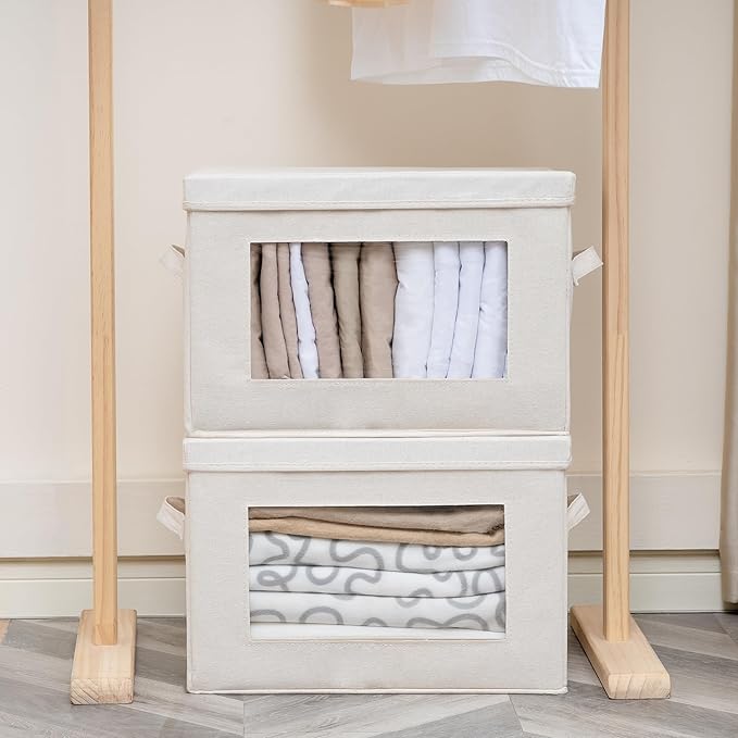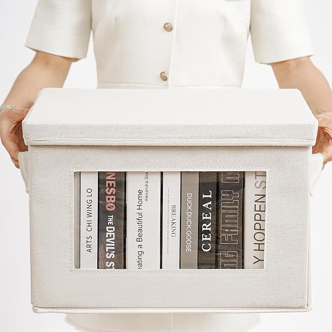 - 【Sturdy and Durable】Our Canvas storage box with lid is crafted from durable, breathable fabric and cardboard. The latest materials are odorless and have a long service life. Designed with sturdy handles sewn onto the cardboard, this box is ideal for carrying heavy loads and for your long term storage needs
