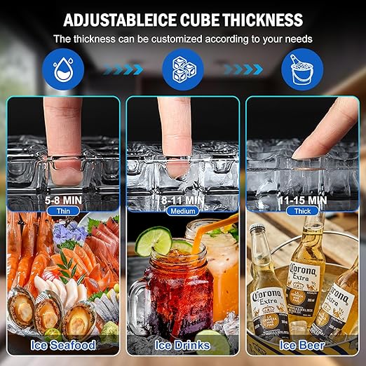 - SMART OPERATION & INDICATOR LIGHTS: This undercounter ice maker machine features a user-friendly control panel with a clear LCD. The under counter ice machine offers multiple functions, including adjustable ice thickness, timer settings, one-touch auto cleaning, and indicator light alerts. The top lid is designed with a sliding mechanism for easy access. An ice scoop is also included for convenience.
