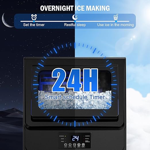 - POWERFUL COMPRESSOR & EFFICIENT ICE MAKING: Equipped with a powerful, low-noise compressor, this commercial ice maker delivers fast, quiet, and efficient performance. The ice machine features an automatic overflow prevention function and ice full tips that prevent ice from spilling. The built-in blue LED lighting improves visibility so you can easily monitor the ice-making process.