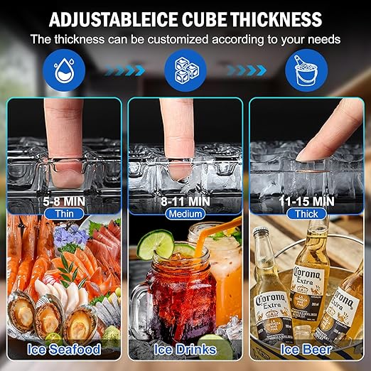- SMART OPERATION & INDICATOR LIGHTS: This undercounter ice maker machine features a user-friendly control panel with a clear LCD. The under counter ice machine offers multiple functions, including adjustable ice thickness, timer settings, one-touch auto cleaning, and indicator light alerts. The top lid is designed with a sliding mechanism for easy access. An ice scoop is also included for convenience.